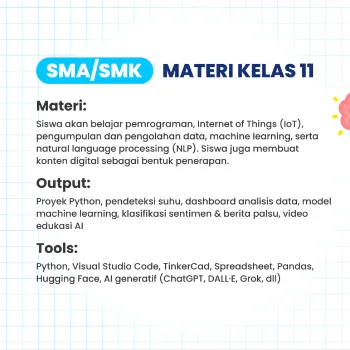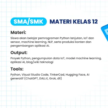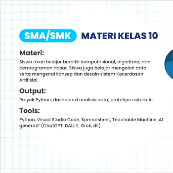 Paket pembelajaran digital yang dirancang secara khusus berdasarkan Naskah Akademik Koding dan Kecerdasan Artifisial (KA) dari Kemendikdasmen. Tersedia dalam LMS (Learning Management System) dan modul ajar terstruktur untuk Fase E (Kelas 10 SMA) serta Fase F (Kelas 11 dan 12 SMA), memastikan implementasi kurikulum yang presisi dan berkualitas.
