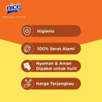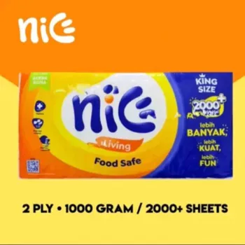 - Nice tisu Kiloan “One for all cleaning purpose Tisu”, mampu membersihkan semua dalam satu tisu, berfungsi membersihkan area wajah, mulut dan kulit tubuh dari keringat, kotoran yang menempel di peralatan dapur serta membasuh dan mengeringkan bagian area intim.