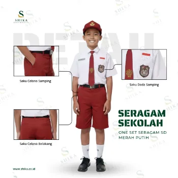 Oneset/Setelan ------------------------- Kemeja: Lengan pendek, Bordir woven bendera merah putih, Bordir woven SD. Celana: Celana panjang. Bahan ---------- Kemeja: Polyester 65 persen, Katun 35 persen. Celana: Polyester 65 persen, Rayon 35 persen. Size ------- S, M, L, XL, XXL, XXXL, XXXXL, XXXXXL (selebihnya size XXL akan dikenakan biaya tambahan, berlaku untuk kelipatan size) Warna ---------- Kemeja: Putih Celana: Merah Tua. Info Selengkapnya ------------------------------ Web: www.shika.co.id WA: 081387200168