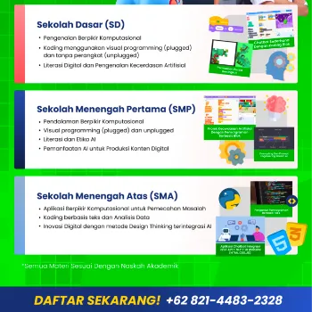 Tingkatkan kompetensi digital pendidik di sekolah dengan program pelatihan guru intensif mengenai Koding dan Kecerdasan Artifisial (KA). Pelatihan ini dirancang secara khusus berdasarkan Naskah Akademik Koding dan Kecerdasan Artifisial (KA) untuk membantu para guru menguasai konsep-konsep teknologi terkini dan mampu mengintegrasikannya secara efektif.