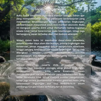 Buku Sadar Ekowisata Indonesia disusun sebagai bahan ajar yang memperkenalkan konsep pariwisata berkelanjutan yang menekankan keseimbangan antara pelestarian lingkungan, pemberdayaan masyarakat lokal, dan manfaat ekonomi. Buku ini mengajak peserta didik untuk memahami bahwa kegiatan wisata tidak hanya berorientasi pada keuntungan, tetapi juga bertanggung jawab terhadap alam dan budaya setempat.