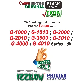 Tinta Canon type GI-790 ini didesign dan diproduksi untuk printer Canon type INKTANK / MEGATANK yang termasuk dalam rumpun (cluster) seri G-1000 ; G-1010 ; G-2000 ; G-2010 ; G-3000 ; G-3010 ; G-4000 ; G-4010 ; dsb.